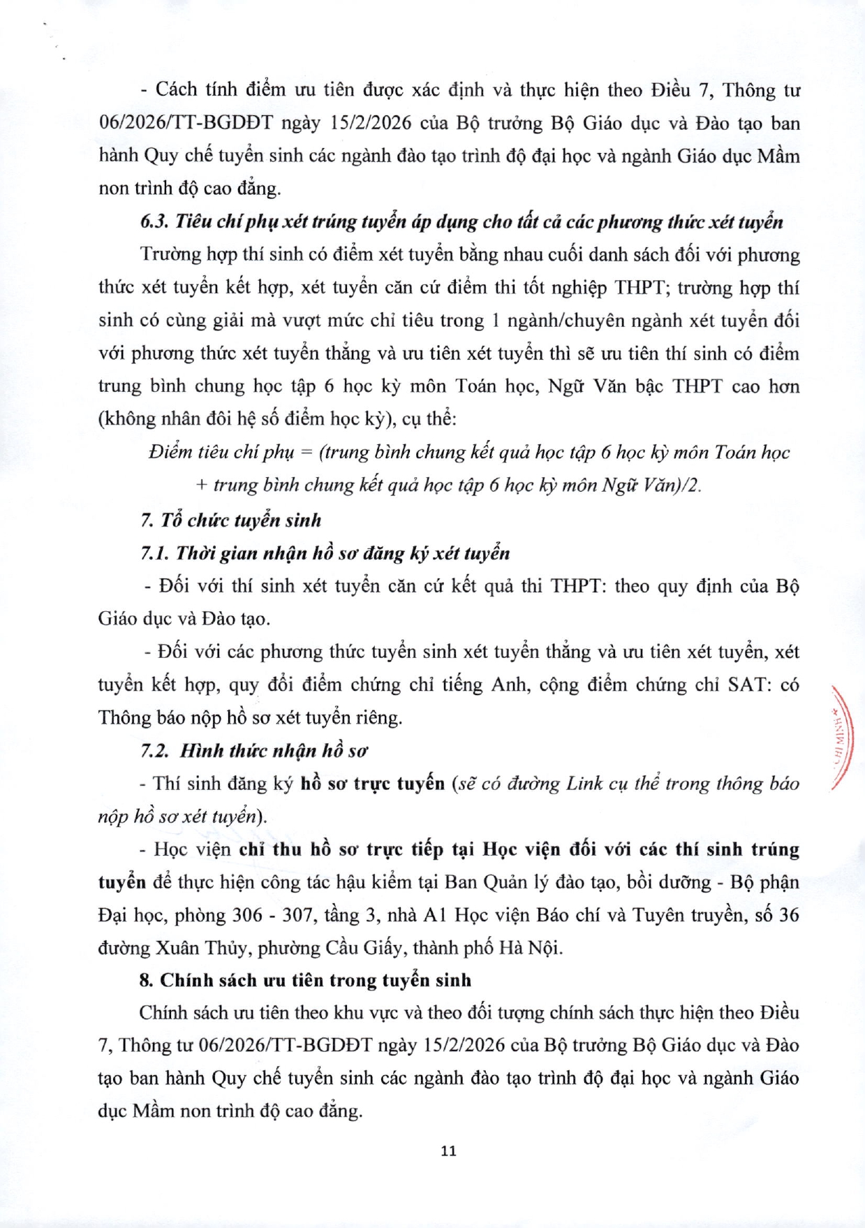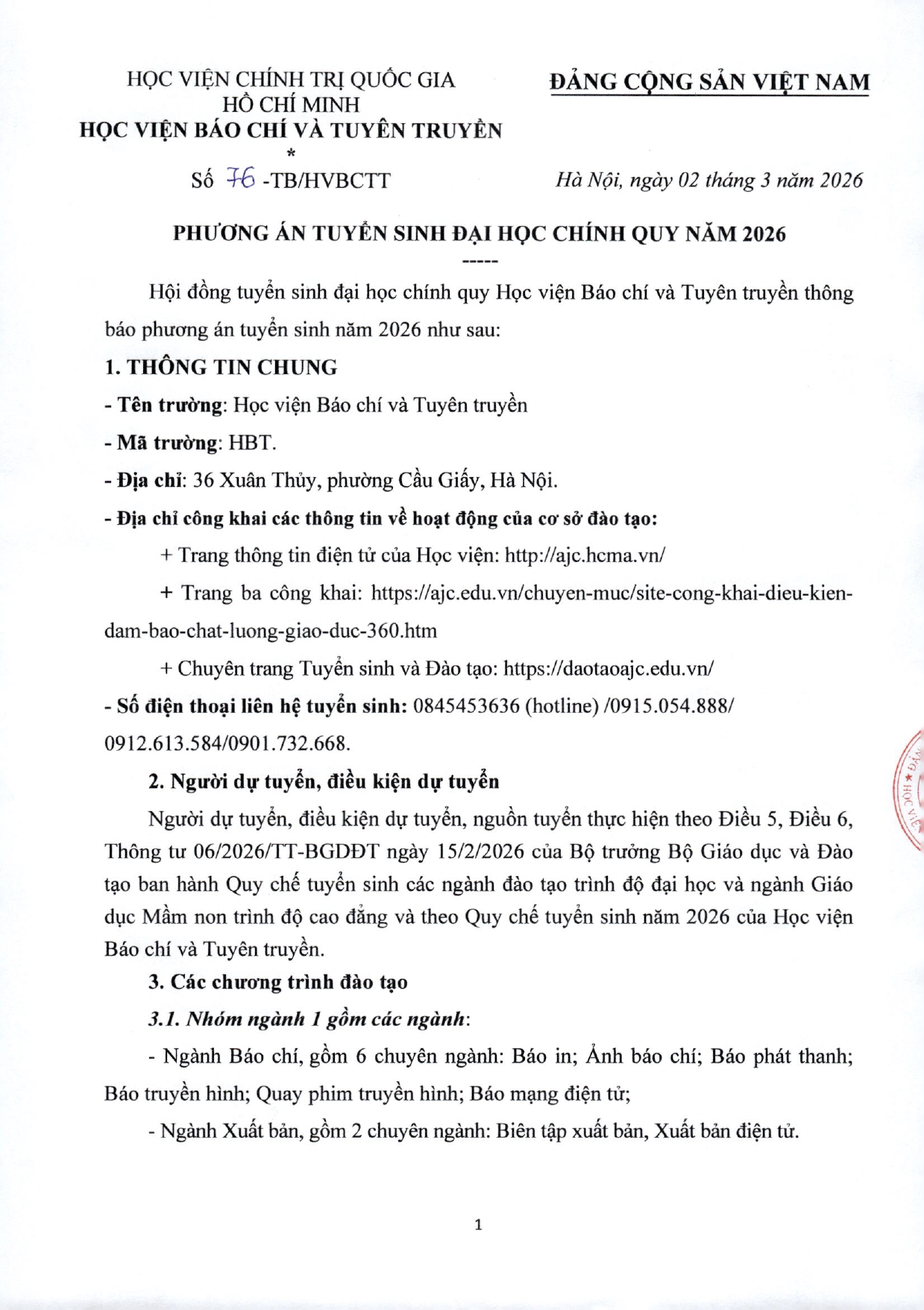 Hội đồng tuyển sinh đại học chính quy Học viện Báo chí và Tuyên truyền thông báo phương án tuyển sinh năm 2026 như sau:
