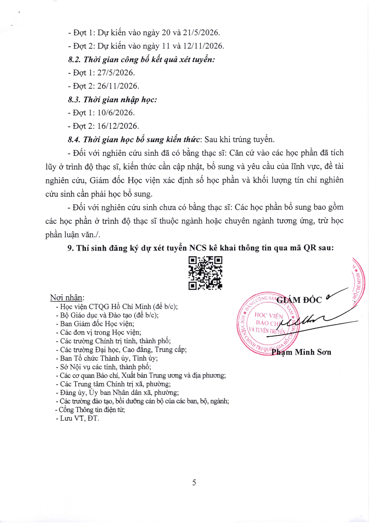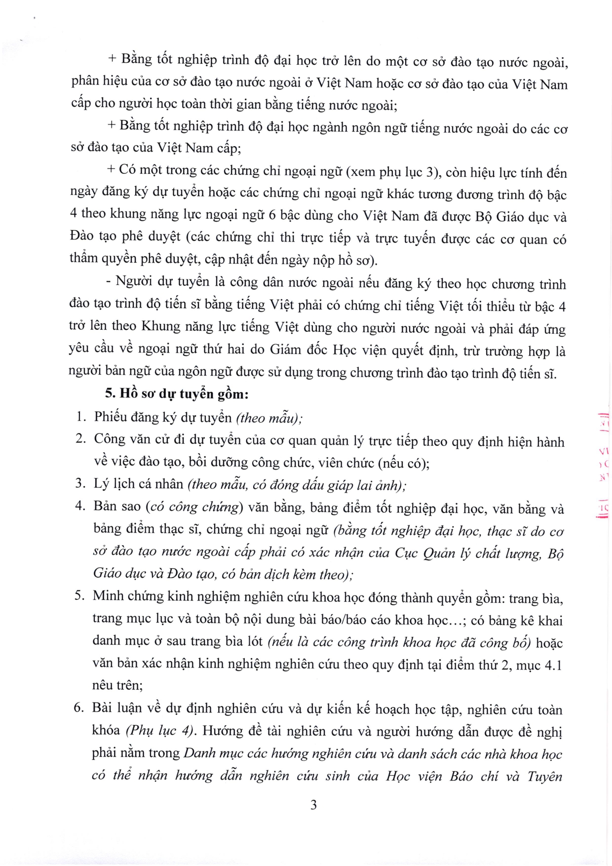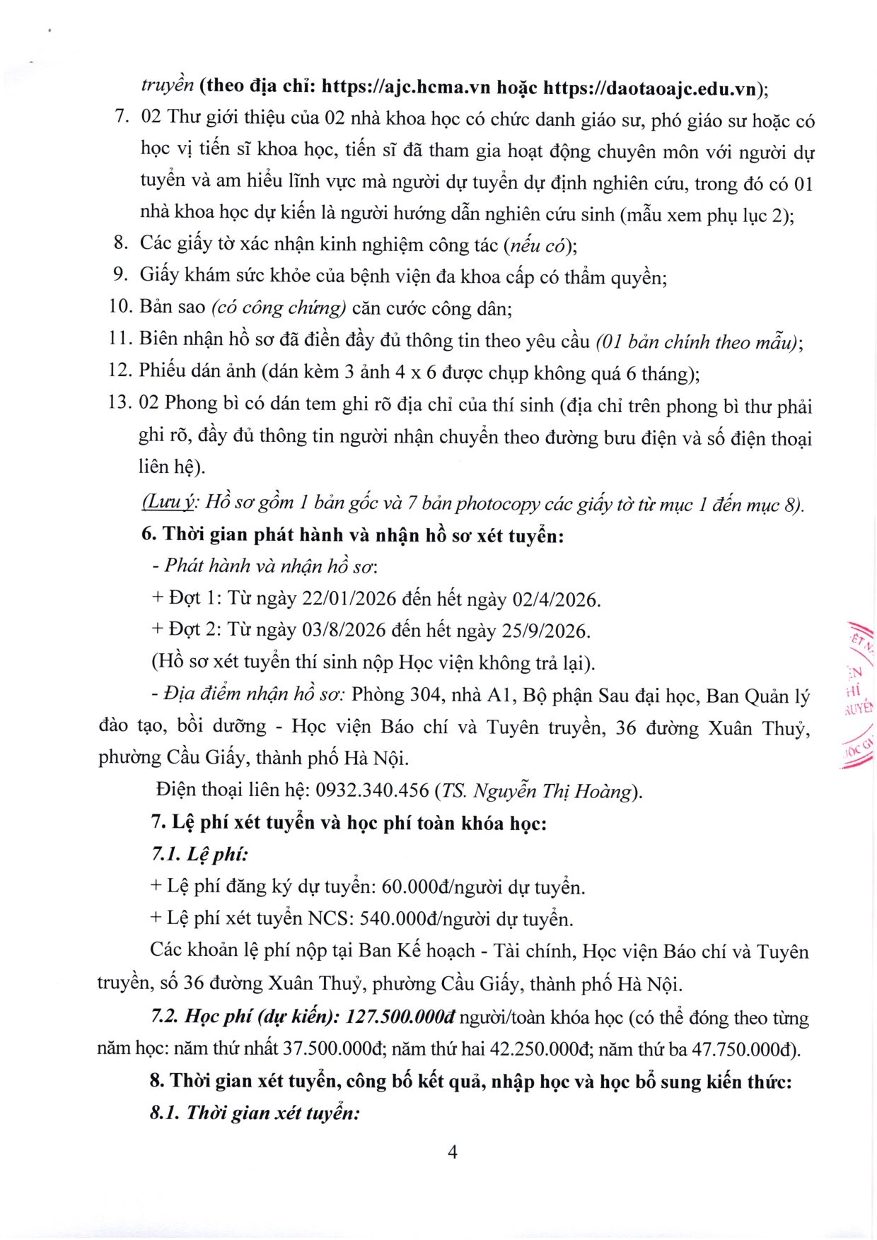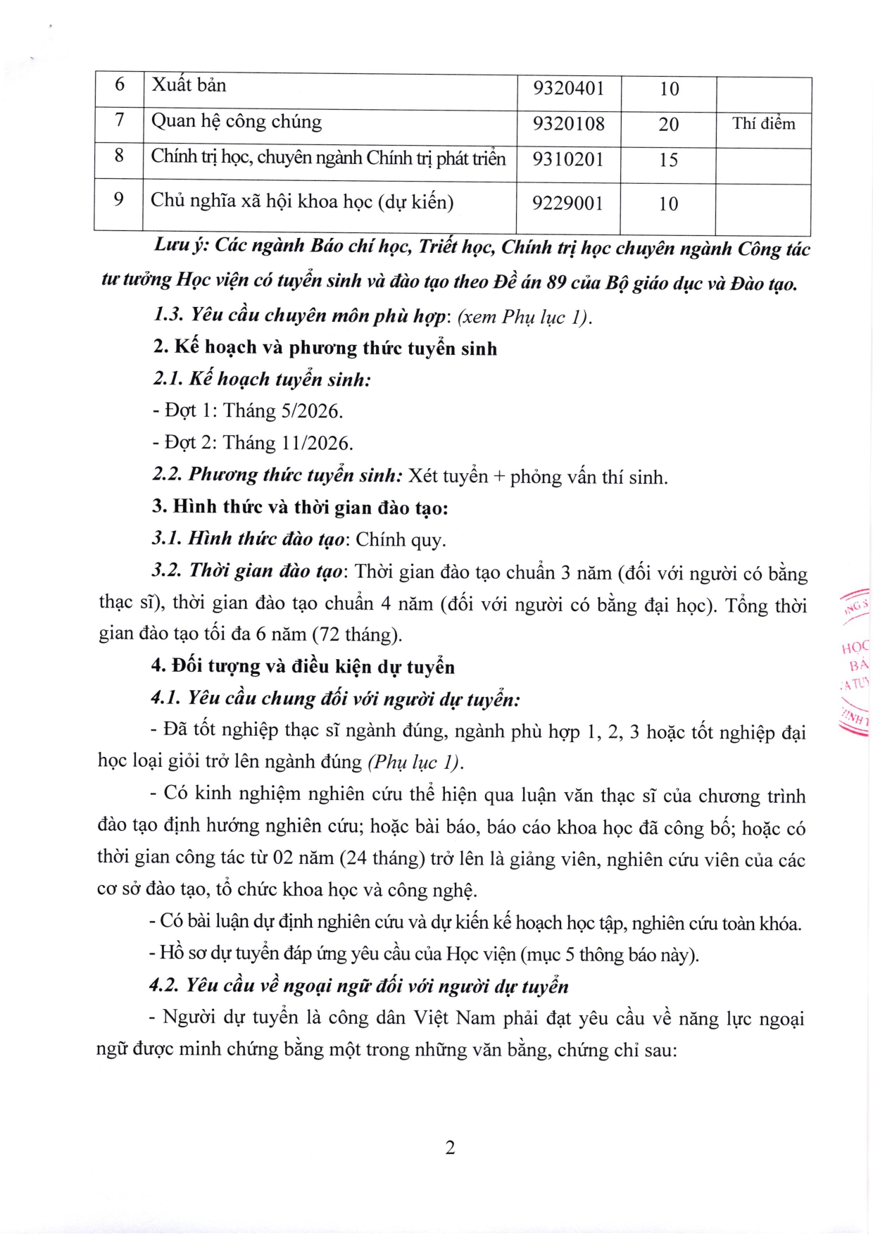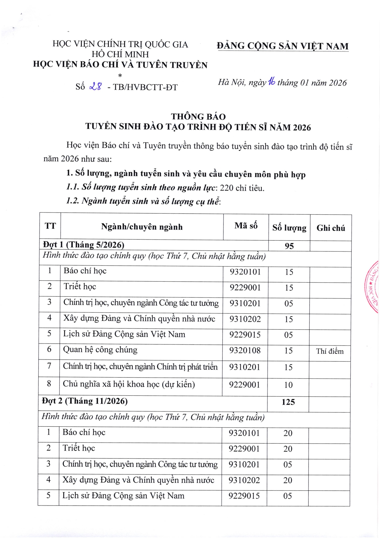 Học viện Báo chí và Tuyên truyền thông báo tuyển sinh đào tạo trình độ tiến sĩ năm 2026 cụ thể như sau: